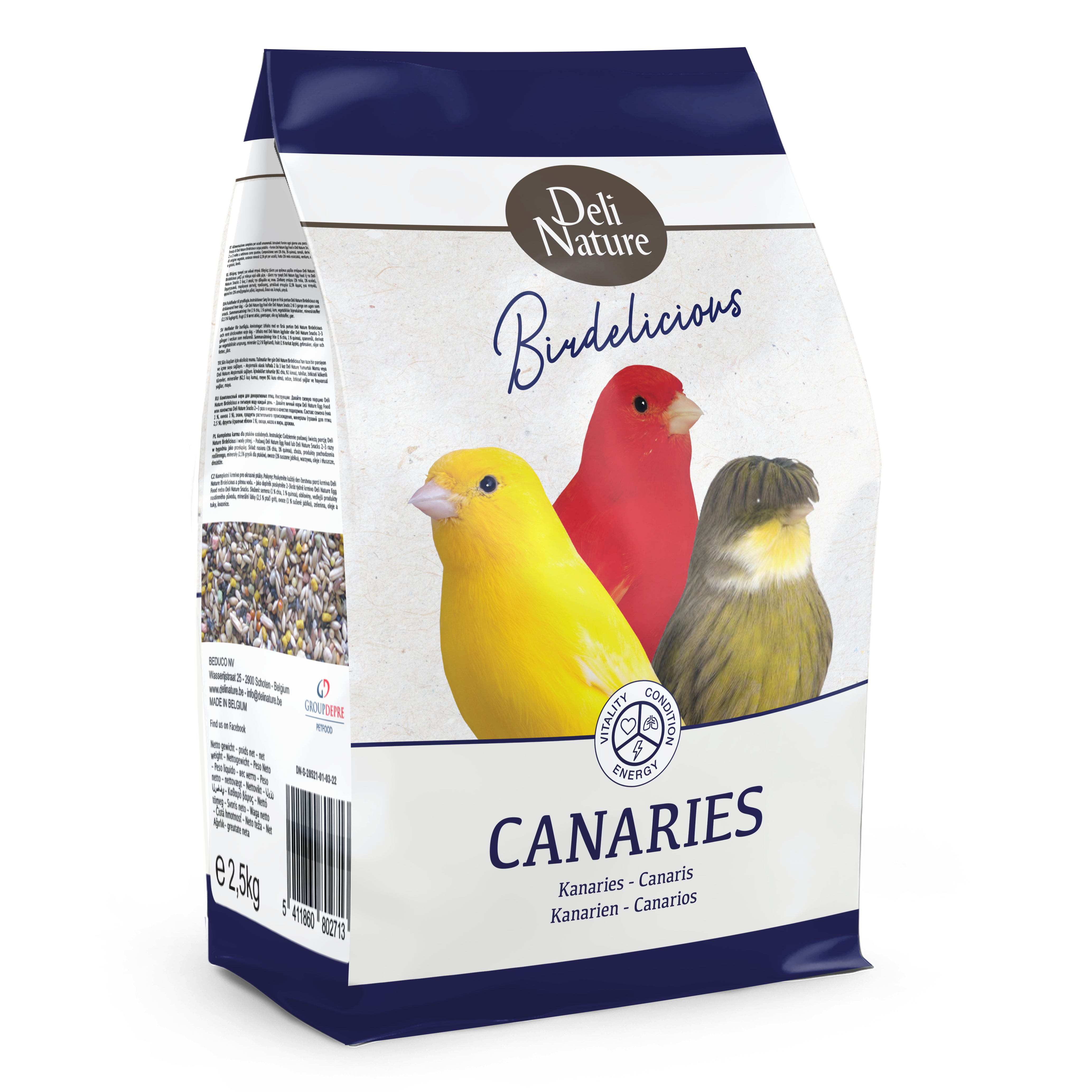 Seeds (1% chia, 1% quinoa), cereals, derivatives of vegetable origin, minerals (2.5% bird grit), fruit (1% dried apple), vegetables, oils and fats, yeast