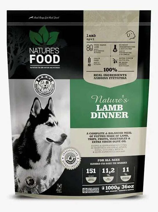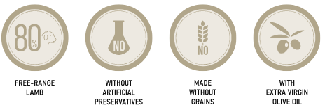 Lamb (80%) (green tripe, offal), vegetables (13%) (peas, carrot, spinach, parsley), fruits (2%) (apple, peach), apple cider vinegar, extra virgin olive oil, egg, mountain tea, dried oregano.