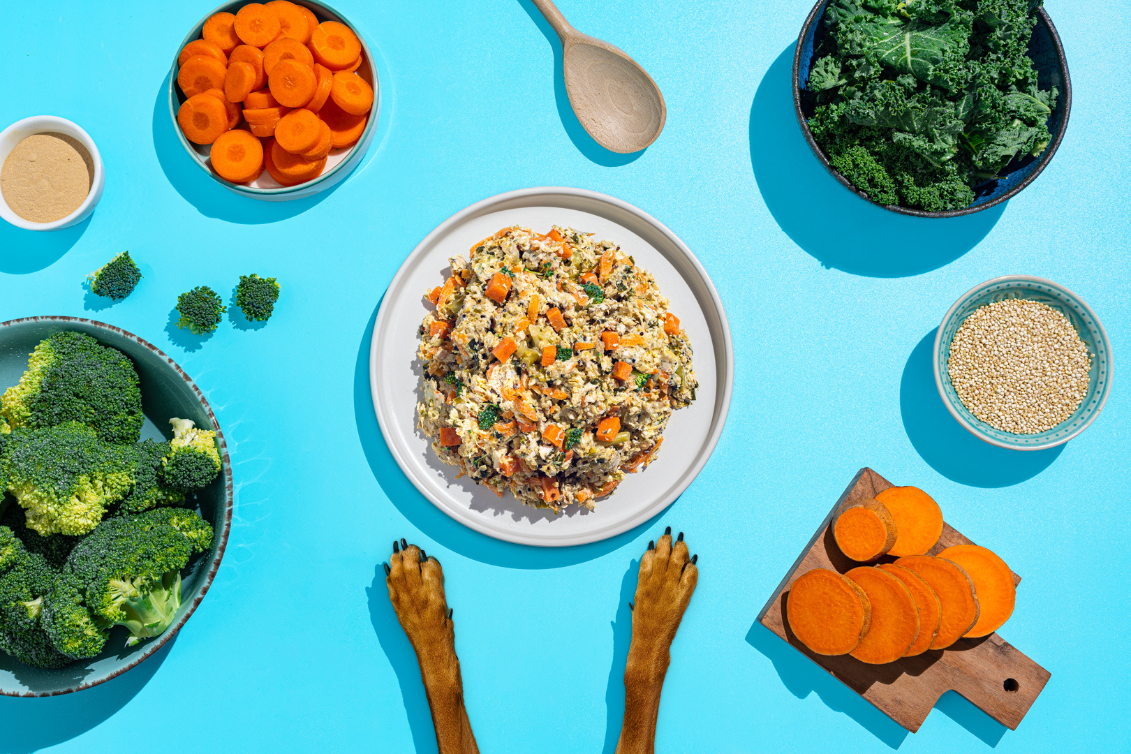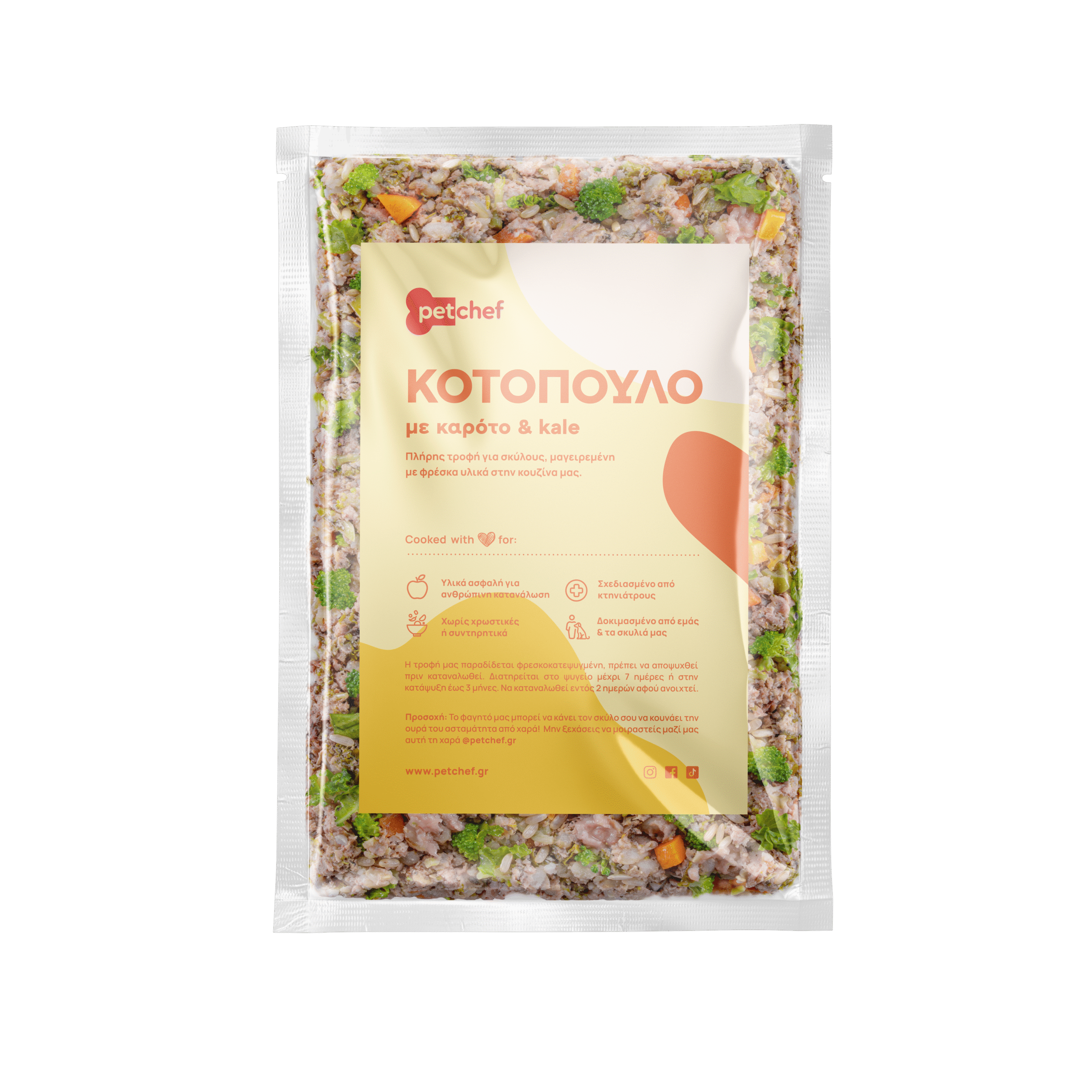 Κοτόπουλο 42% (κιμάς, συκώτι), ρύζι καστανό, γλυκοπατάτα, μπρόκολο, καρότο 6%, kale 4%, βιολογικός λιναρόσπορος αλεσμένος, θυμάρι, αραβοσιτέλαιο, κρόκος αυγού, μουρουνέλαιο.