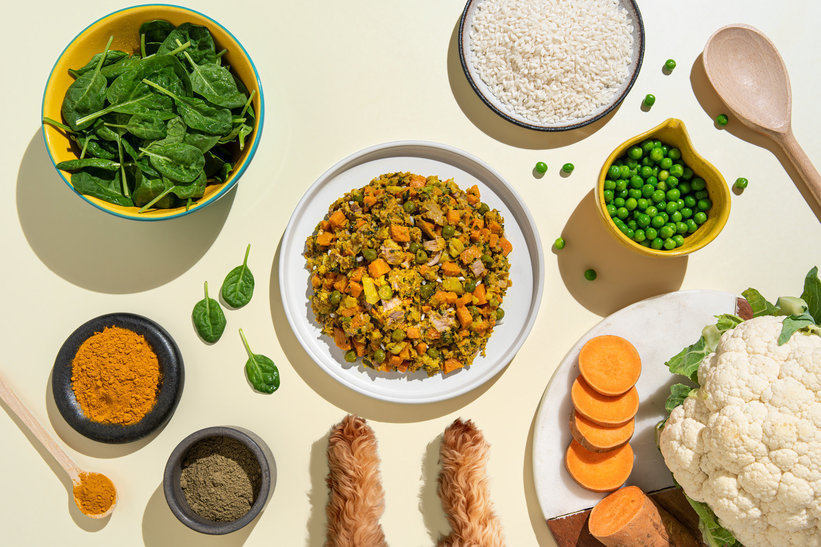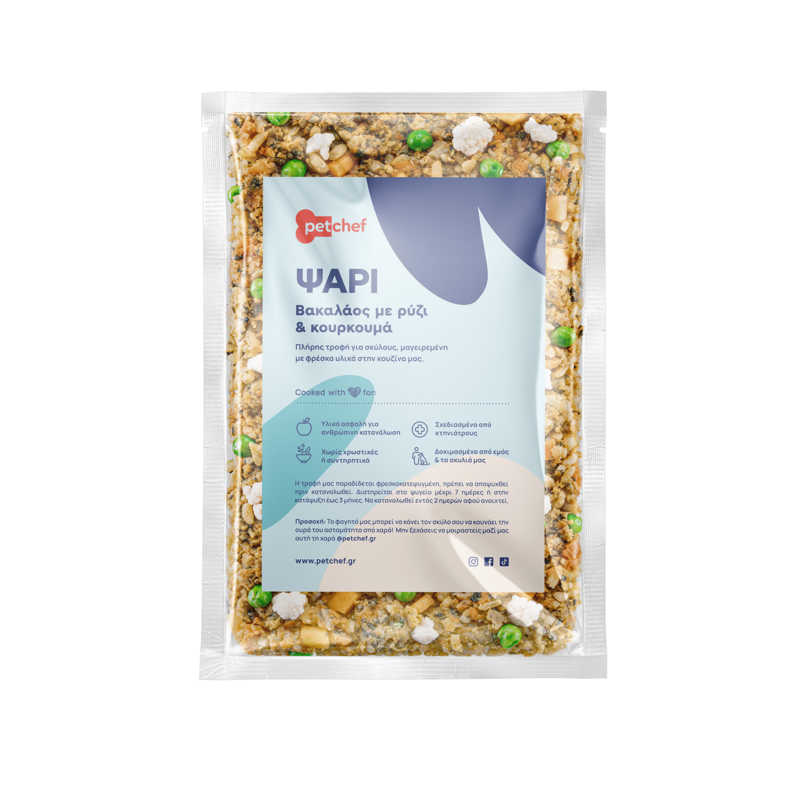 Βακαλάος φιλέτο 19%, σαρδέλα φιλέτο 18%, ρύζι καστανό 27%, γλυκοπατάτα, σπανάκι, κουνουπίδι, βιολογικός λιναρόσπορος αλεσμένος, αρακάς, βιολογικός κουρκουμάς 1%, αραβοσιτέλαιο.