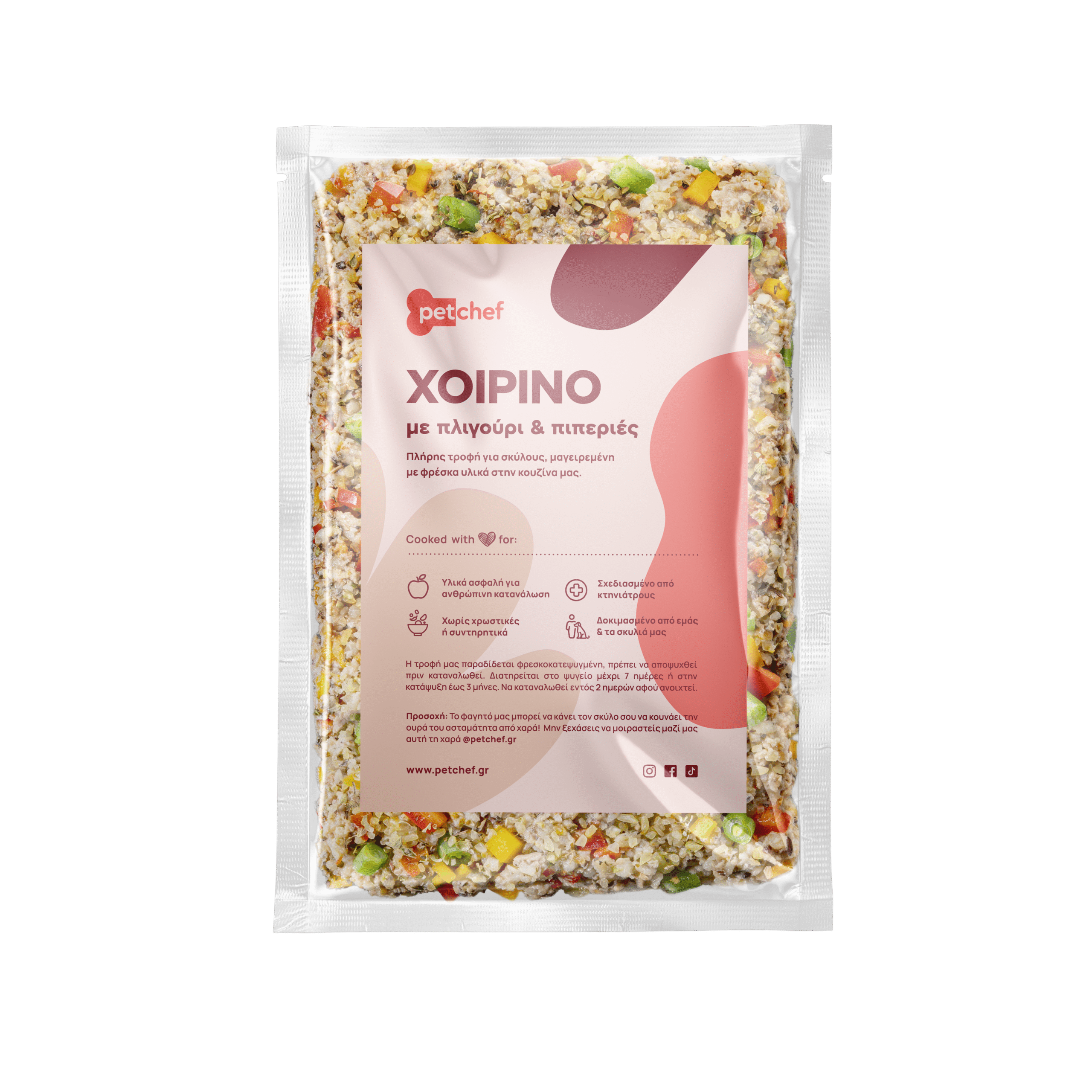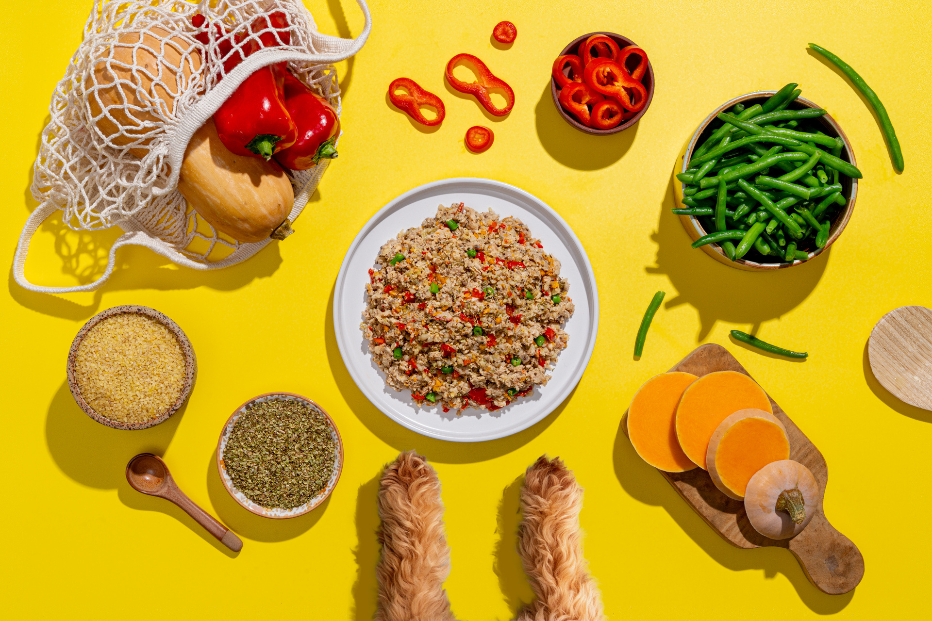 Χοιρινό 41% (κιμάς, συκώτι), πλιγούρι 30%, κολοκύθα, φασολάκια, πιπεριές κόκκινες 3,5%, βιολογικός λιναρόσπορος αλεσμένος, ρίγανη.