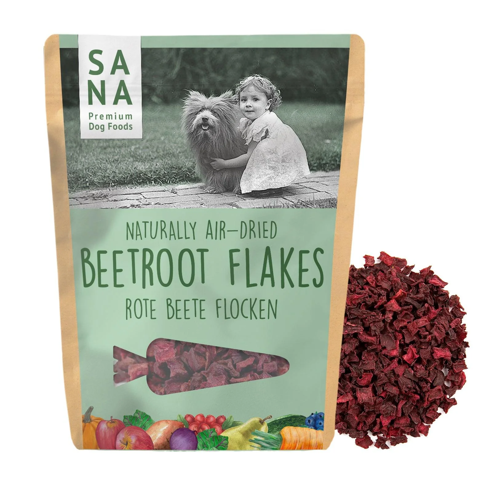 SANADOG vegetable flakes are particularly long-lasting because we remove the moisture and gently dry them at low temperatures. Through this careful processing, all valuable vitamins and aromatic substances are preserved, so your furry friend receives all the important nutrients from our high-quality food supplement.