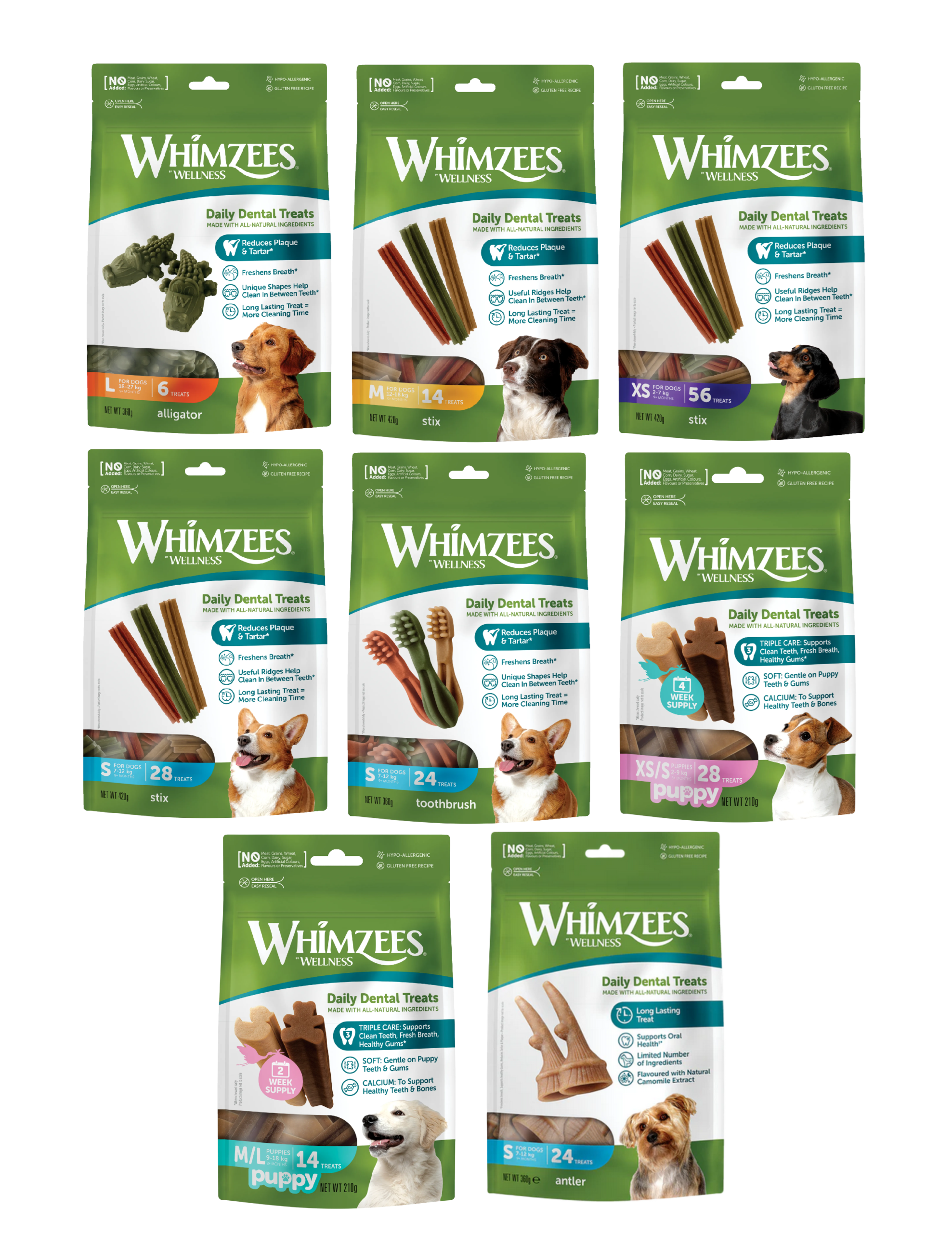 | SIZE | XS/S Puppies, M/L Puppies, XS Soft, S Soft, M Soft, S Stix, M Stix, S Toothbrush, M Toothbrush, S Antlers, L Alligator |